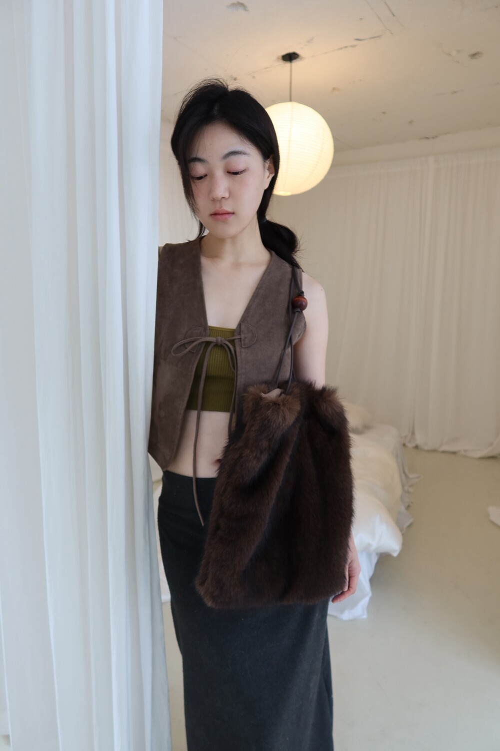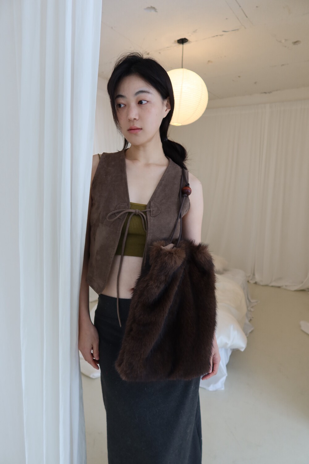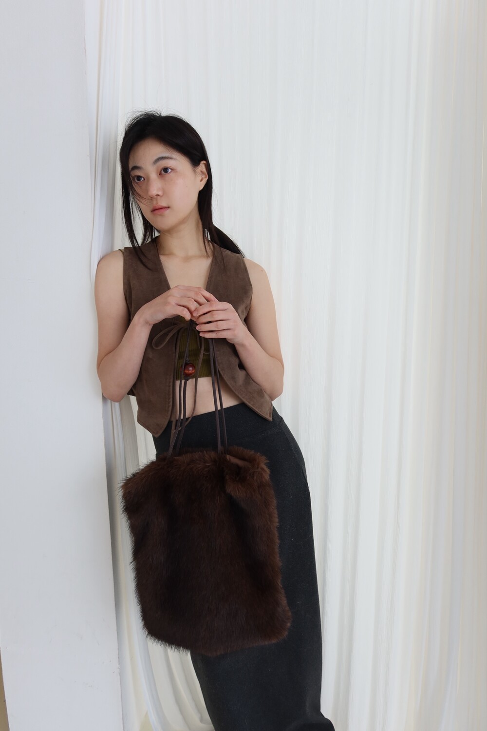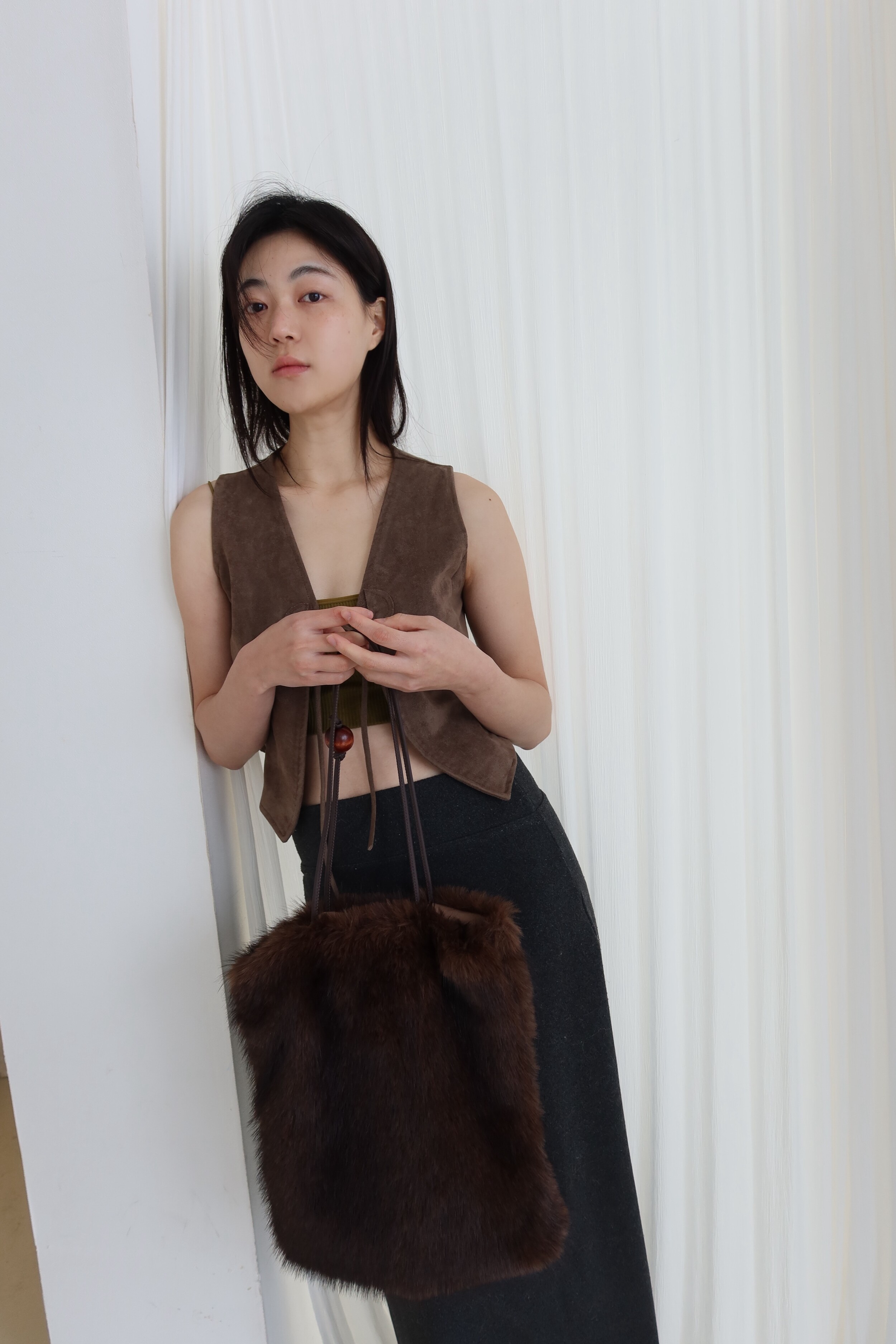 퍼 결이 매우 부드럽고 촉감이 뛰어난 소재로 제작했으며 과하게 길지 않은 퍼 길이로 부해 보이거나 지나치게 럭셔리한 느낌 없이 담백하고 쿨한 실루엣이 특징이 퍼 백 입니다.