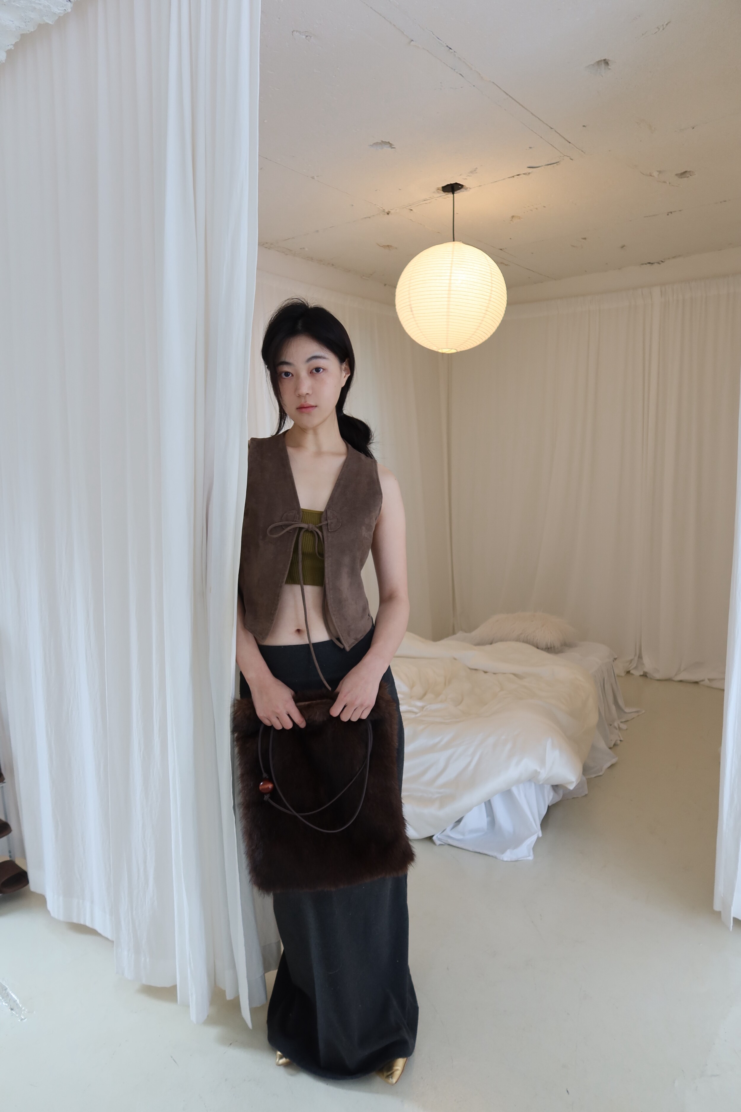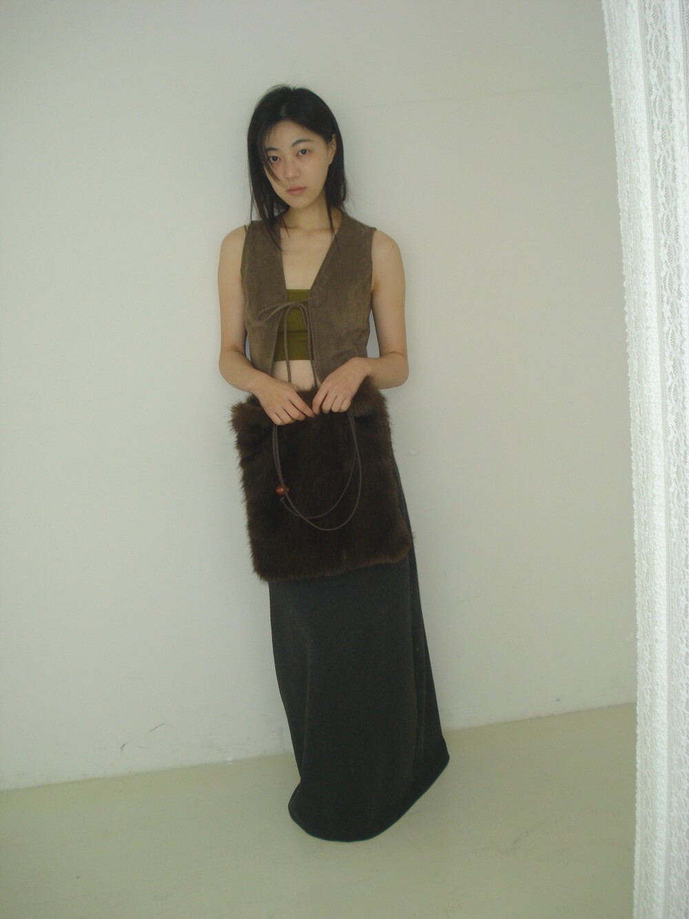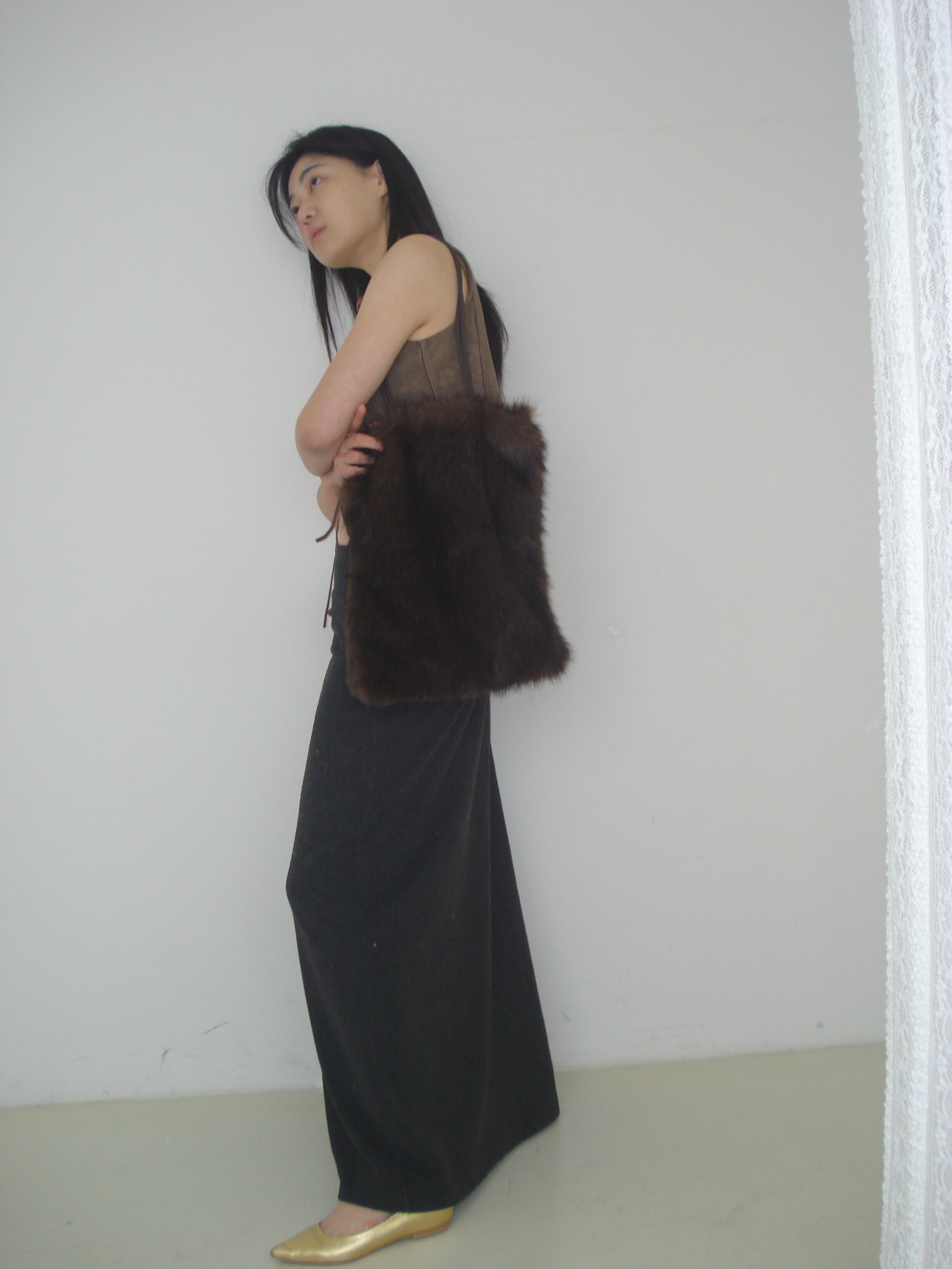 퍼 결이 매우 부드럽고 촉감이 뛰어난 소재로 제작했으며 과하게 길지 않은 퍼 길이로 부해 보이거나 지나치게 럭셔리한 느낌 없이 담백하고 쿨한 실루엣이 특징이 퍼 백 입니다.