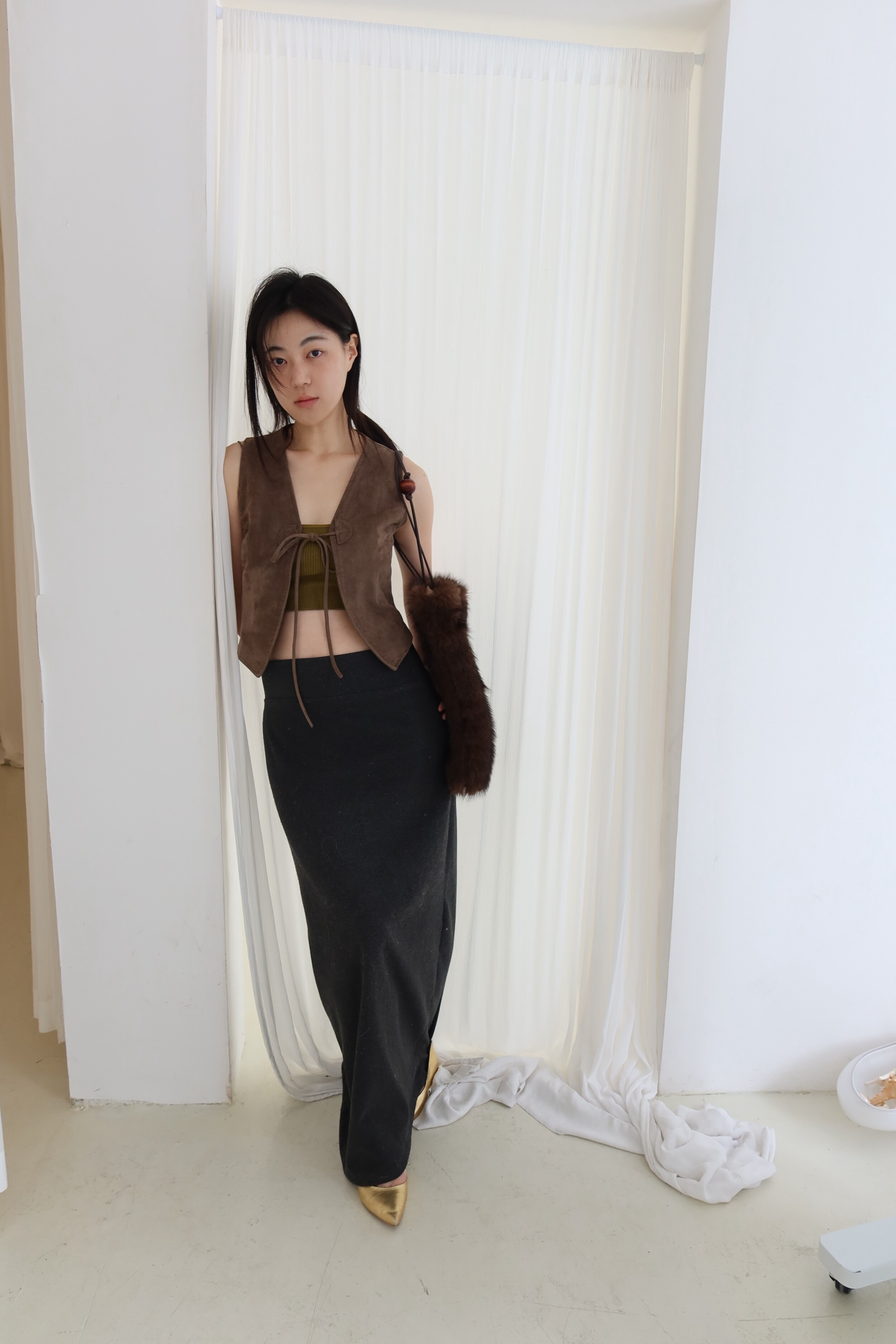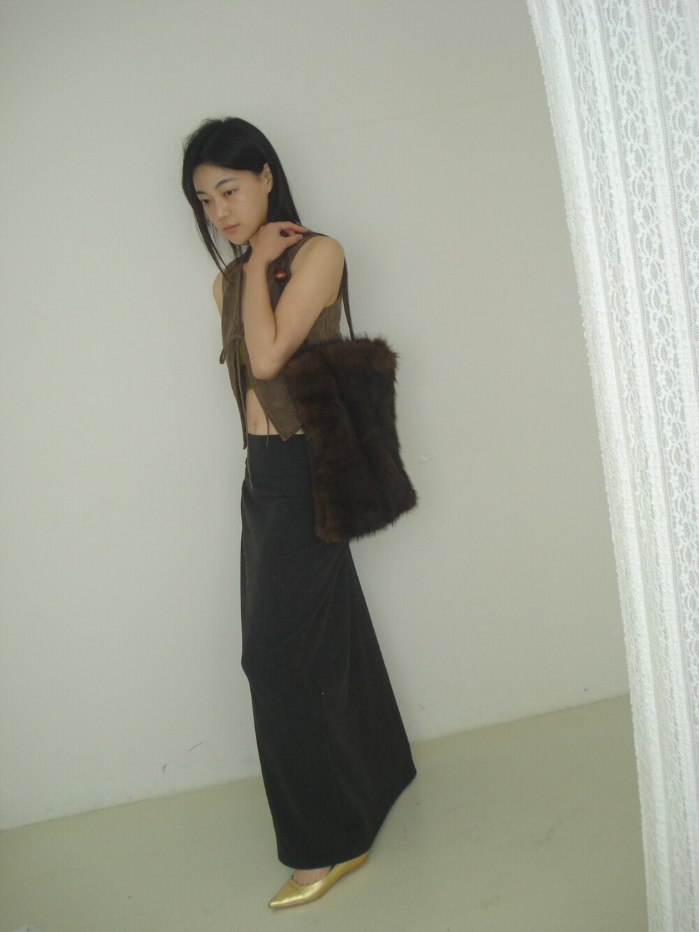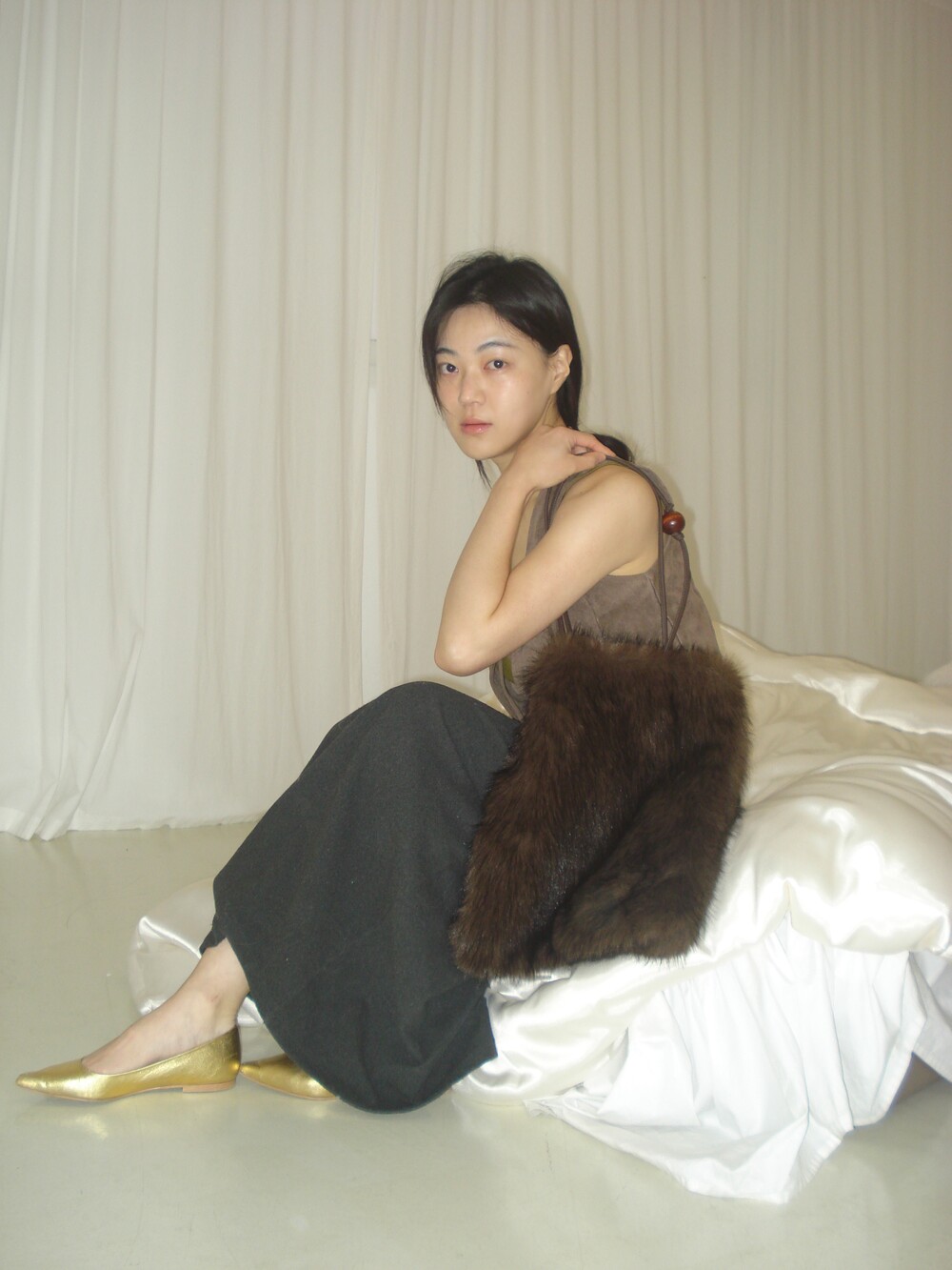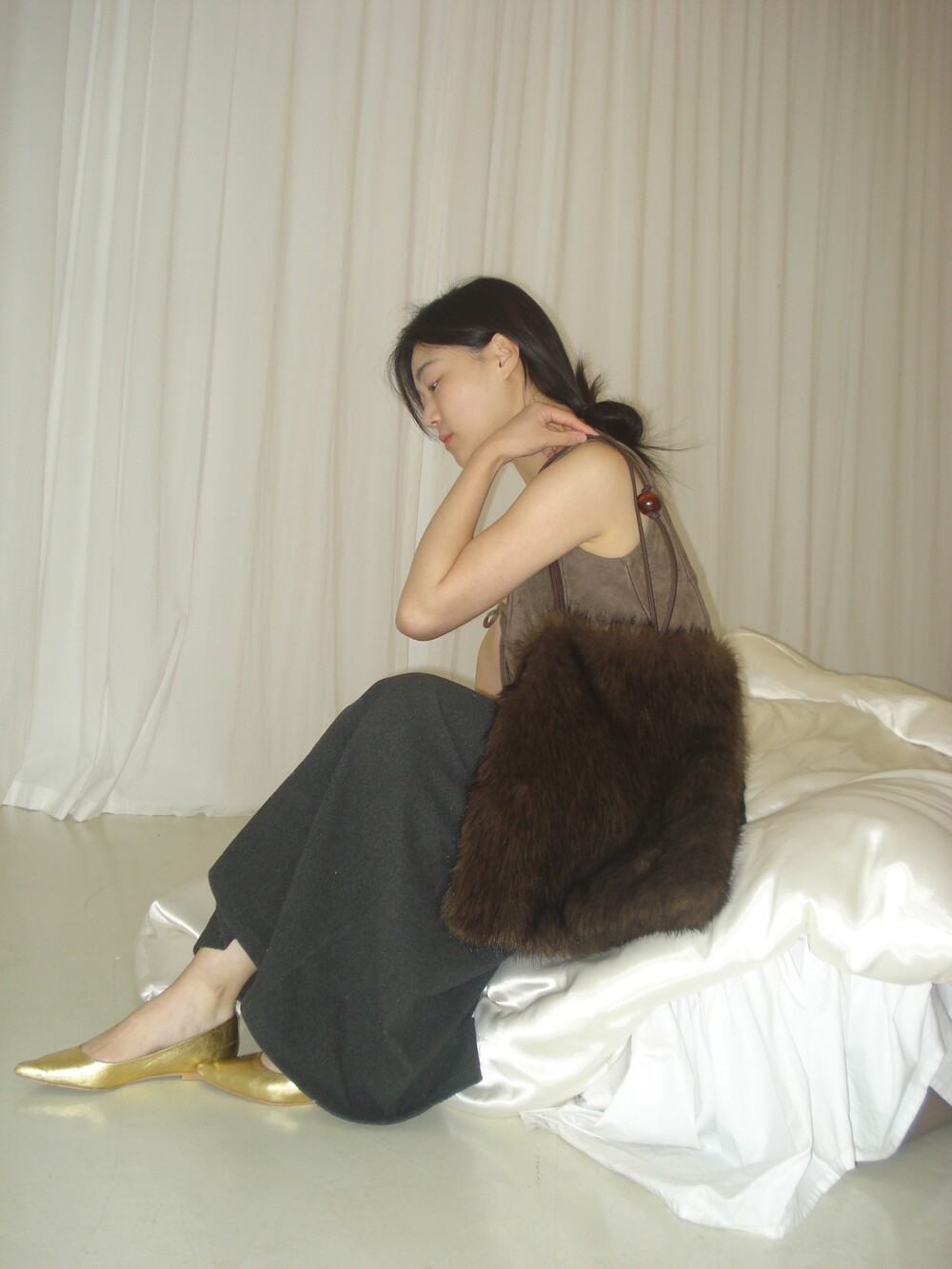 퍼 결이 매우 부드럽고 촉감이 뛰어난 소재로 제작했으며 과하게 길지 않은 퍼 길이로 부해 보이거나 지나치게 럭셔리한 느낌 없이 담백하고 쿨한 실루엣이 특징이 퍼 백 입니다.